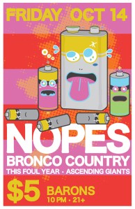 Concert poster for Nopes, Bronco Country, This Foul Year, and Ascending Giants. Created with Adobe Illustrator.